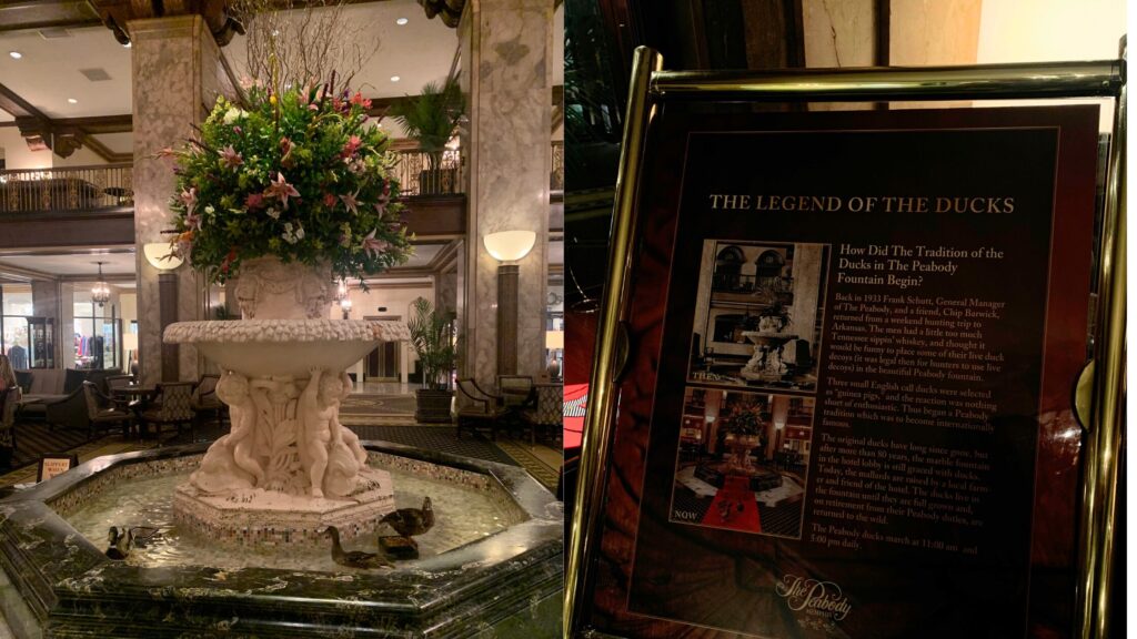 With my belly full of yummy southern cooking, I made my way back to downtown Memphis via Uber and back to the room to relax after an exciting morning. I then started to plan out what to do the rest of my day. I decided to start my exploring at The Peabody Hotel. This hotel is home to the Peabody Ducks! That’s right, ducks. These mallards live in the hotel lobby fountain and are a major attraction for Memphis tourists. They make daily marches along a red carpet to and from their home on the rooftop: The Royal Duck Palace. How. Freaking. Cute.